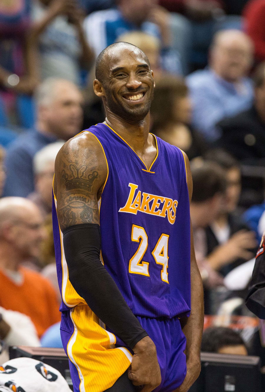 Dec 14, 2014; Minneapolis, MN, USA; Los Angeles Lakers guard Kobe Bryant (24) laughs against the Minnesota Timberwolves at Target Center. The Lakers defeated the Timberwolves 100-94. Mandatory Credit: Brace Hemmelgarn-USA TODAY Sports