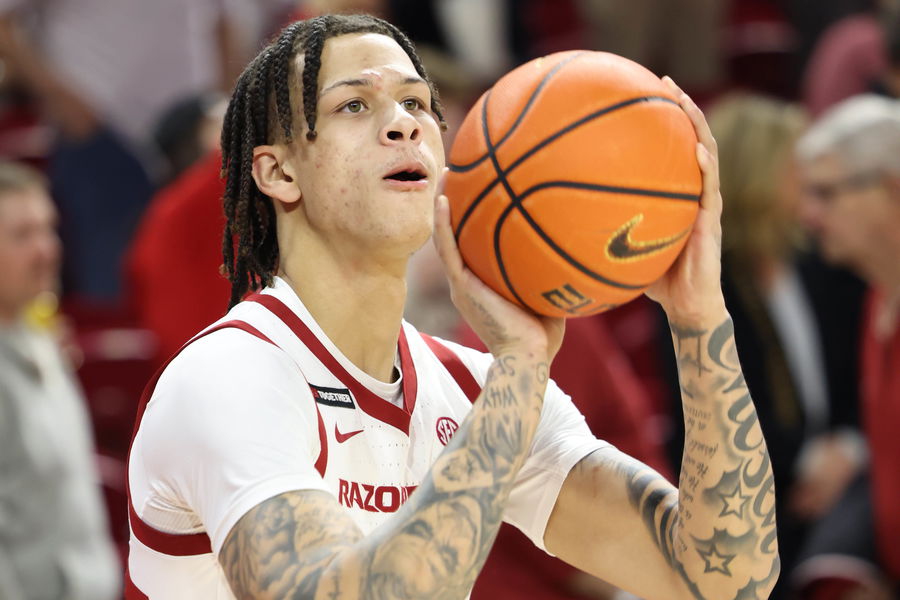 Dec 30, 2024; Fayetteville, Arkansas, USA; Arkansas Razorbacks forward Trevon Brazile warms up prior to the game against the Oakland Golden Grizzlies at Bud Walton Arena. Mandatory Credit: Nelson Chenault-Imagn Images