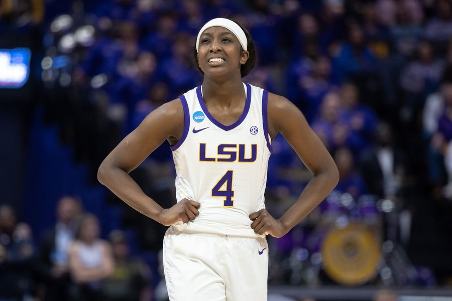 Mar 24, 2024; Baton Rouge, Louisiana, USA; LSU Lady Tigers guard Flau’jae Johnson (4) looks on against the Middle Tennessee Blue Raiders during the second half at Pete Maravich Assembly Center. Mandatory Credit: Stephen Lew-USA TODAY Sports