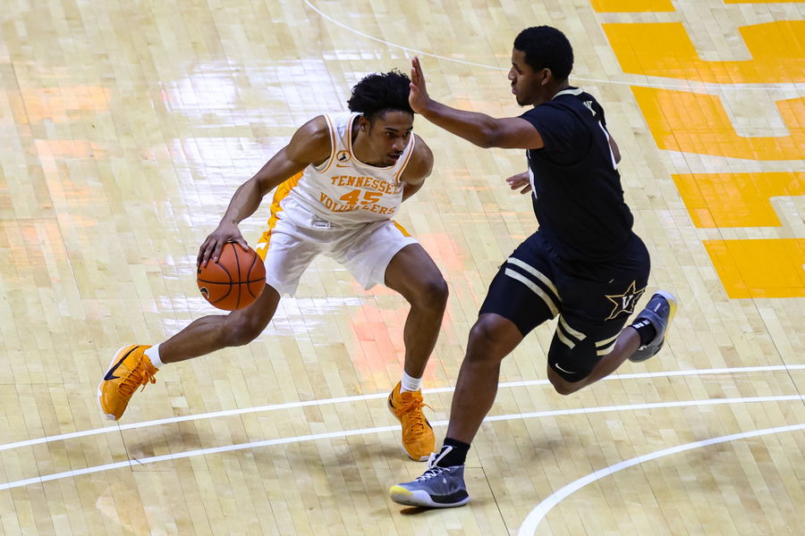 Jan 16, 2021; Knoxville, Tennessee, USA; Tennessee Volunteers guard Keon Johnson (45) moves the ball against Vanderbilt Commodores guard Jordan Wright (4) during the second half at Thompson-Boling Arena. Mandatory Credit: Randy Sartin-USA TODAY Sports