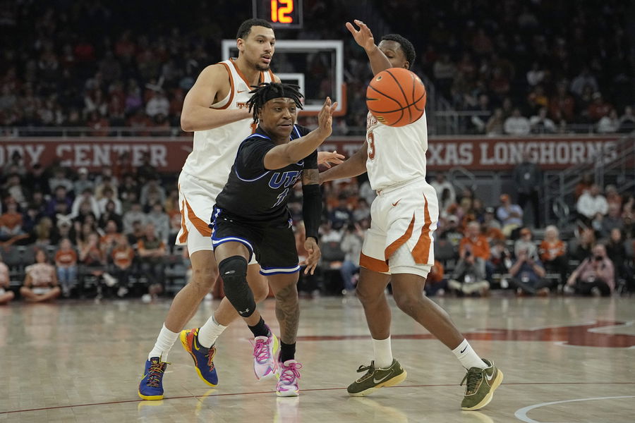 Jan 1, 2024; Austin, Texas, USA; Texas-Arlington Mavericks guard Phillip Russell (1) passes the ball while defended by Texas Longhorns guard Max Abmas (3) and forward Dylan Disu (1) during the second half against the Texas Longhorns at Moody Center. Mandatory Credit: Scott Wachter-USA TODAY Sports