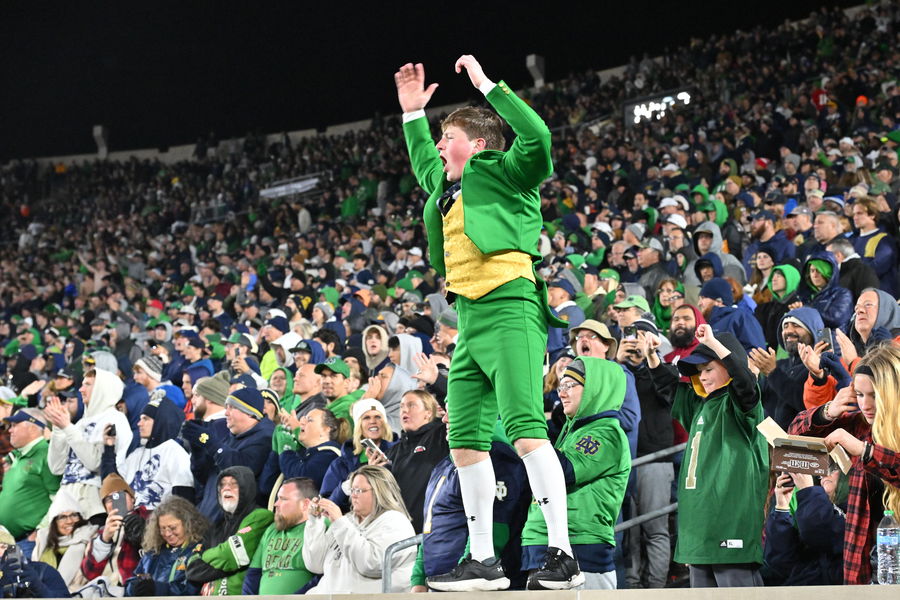 Nov 16, 2024; South Bend, Indiana, USA; The Notre Dame Leprechaun mascot cheers in the fourth quarter of a game between the Notre Dame Fighting Irish and the Virginia Cavaliers at Notre Dame Stadium. Mandatory Credit: Matt Cashore-Imagn Images