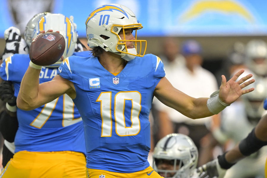 Sep 8, 2024; Inglewood, California, USA; Los Angeles Chargers quarterback Justin Herbert (10) looks to pass in the second half against the Las Vegas Raiders at SoFi Stadium. Mandatory Credit: Jayne Kamin-Oncea-Imagn Images
