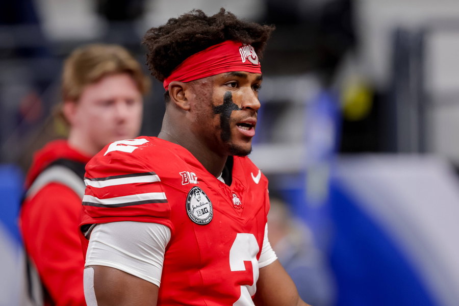 December 6, 2025, Indianapolis, Indiana, USA: Ohio State Buckeyes safety Caleb Downs 2 warms up prior to the game between the Ohio State Buckeyes and the Indiana Hoosiers at Lucas Oil Stadium, Indianapolis, Indiana. Indianapolis USA – ZUMAs304 20251206_zaf_s304_066 Copyright: xScottxStuartx