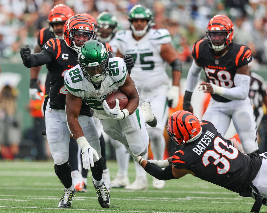 Sep 25, 2022; East Rutherford, New Jersey, USA; New York Jets running back Breece Hall (20) runs with the ball against the Cincinnati Bengals during the second half at MetLife Stadium. Mandatory Credit: Ed Mulholland-USA TODAY Sports