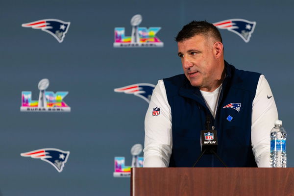 SANTA CLARA, CA – FEBRUARY 03: Head Coach Mike Vrabel of the New England Patriots speaks with the media on February 3, 2026 at Santa Clara Marriott in Santa Clara, CA. Photo by Matthew Huang/Icon Sportswire NFL, American Football Herren, USA FEB 03 Super Bowl LX New England Patriots EDITORIAL USE ONLY Icon260203006