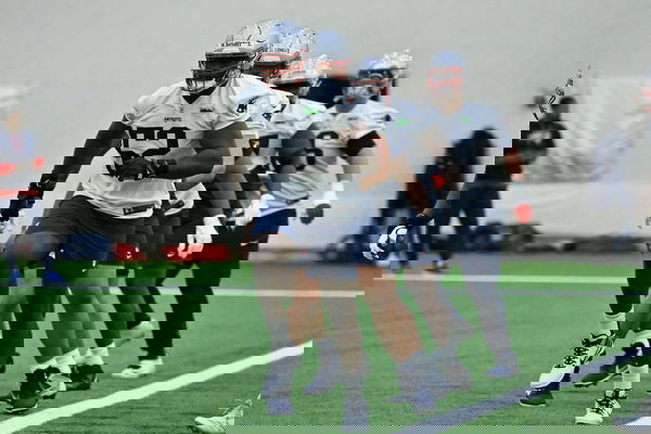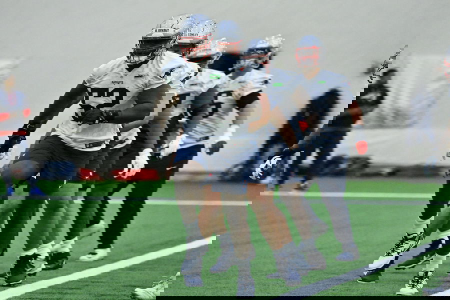 NFL, American Football Herren, USA New England Patriots Rookie Minicamp May 9, 2025 Foxborough, MA, USA New England Patriots offensive tackle Marcus Bryant 52 practices during rookie camp at Gillette Stadium. Foxborough MA USA, EDITORIAL USE ONLY PUBLICATIONxINxGERxSUIxAUTxONLY Copyright: xEricxCanhax 20250509_jla_qe2_184