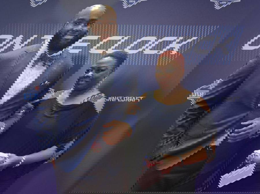 Virginia tackle Morgan Moses poses for photos with his mother Marion Graves upon arriving for the first round of the 2014 NFL Draft