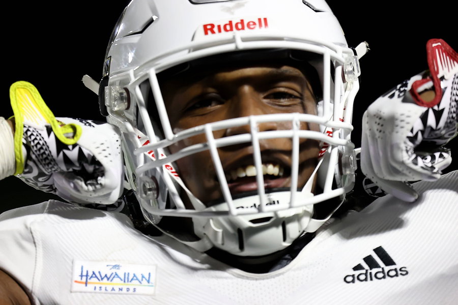 January 22, 2022 – Team Makai linebacker Jaishawn Barham 2 St. Frances Academy / Maryland commit celebrates after intercepting a pass and scoring a touchdown during the Polynesian Bowl high school football showcase at KAnuiÄkea Stadium on the Kamehameha Schools KapÄlama campus in Honolulu, Hawaii – /CSM Honolulu USA – ZUMAc04_ 20220122_zaf_c04_369 Copyright: xAndrewxLeex