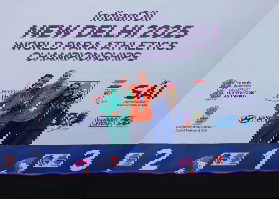 September 27, 2025, New Delhi, Delhi, India IND: Cheyenne Bouthoorn of Netherlands Gold, Kirra Wright Australia Silver and Kate Hwang of USA Bronze at Victory ceremony of Women s Shot Put F36 during day 1 of World Para Athletics Championships 2025 at Jawaharlal Nehru Stadium, New Delhi, India on 27 September 2025. New Delhi India IND – ZUMAd207 20250927_zsp_d207_018 Copyright: xAvijitxDasx