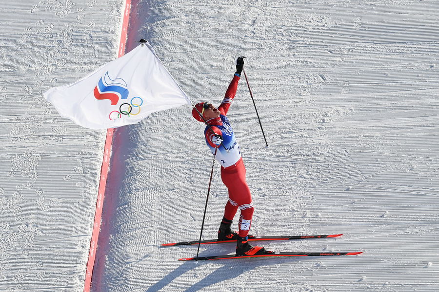 ZHANGJIAKOU, CHINA – FEBRUARY 06: Alexander Bolshunov of Team ROC celebrates crossing the finish line to win the gold medal during the Men’s Cross-Country Skiing 15km + 15km Skiathlon on Day 2 of the Beijing 2022 Winter Olympic Games at The National Cross-Country Skiing Centre on February 06, 2022 in Zhangjiakou, China. (Photo by Matthias Hangst/Getty Images)