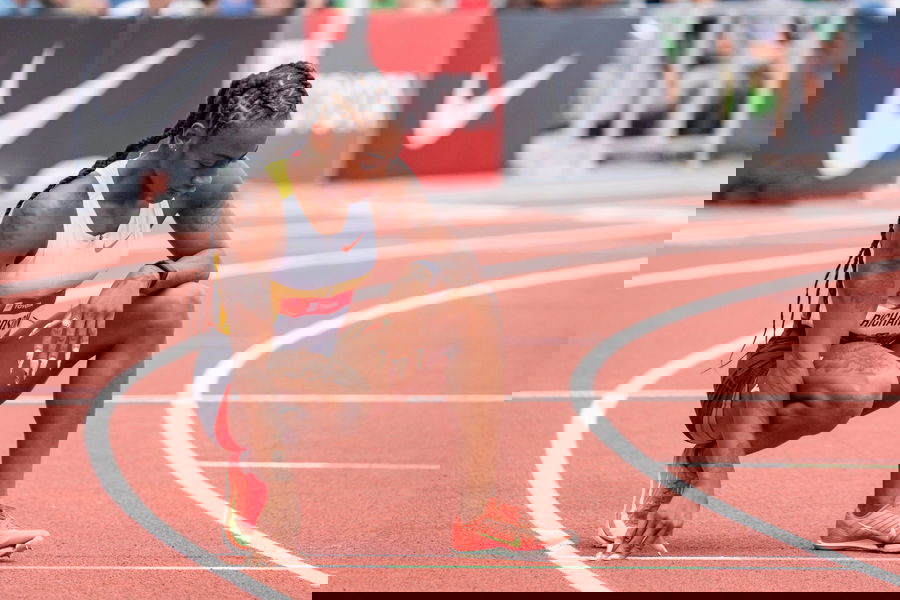 Syndication: The Register Guard Sha Carri Richardson rests after the semifinals of the womens 200 meters during day four of the USATF Outdoor & Para National Championships at Hayward Field in Eugene on Aug. 3, 2025. Eugene , EDITORIAL USE ONLY PUBLICATIONxINxGERxSUIxAUTxONLY Copyright: xBenxLonergan/ThexRegister-Guardx USATSI_26769448