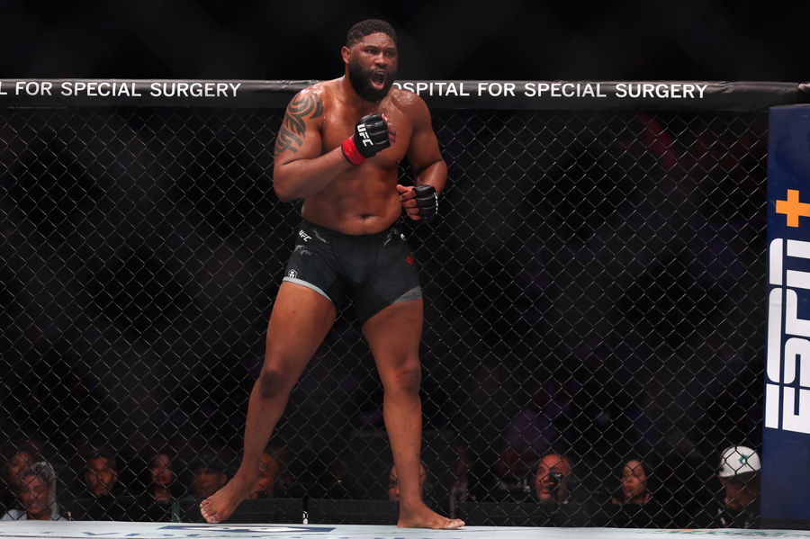 MIAMI, FLORIDA – MARCH 09: Curtis Blaydes reacts after defeating Jailton Almeida of Brazil during their heavyweight bout at UFC 299 at Kaseya Center on March 09, 2024 in Miami, Florida. (Photo by Megan Briggs/Getty Images)