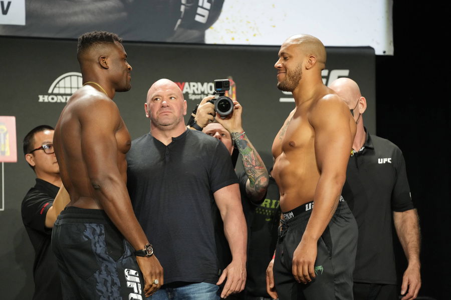 January 21, 2022, Anaheim, California, ANAHEIM, CA, United States: ANAHEIM, CA – January 21: Francis Ngannou left and Cyril Gane right face-off at the ceremonial weigh-ins in front of California fans at Anaheim Convention Center for UFC270 – Ngannou vs Gane – Ceremonial Weigh-in on January 21, 2022 in Anaheim, California, United States. Anaheim, California United States – ZUMAp175 20220121_zsa_p175_110 Copyright: xLouisxGrassex