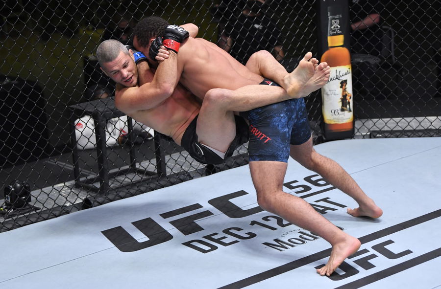 LAS VEGAS, NEVADA – DECEMBER 05: (R-L) Jordan Leavitt slams Matt Wiman in a lightweight bout during the UFC Fight Night event at UFC APEX on December 05, 2020 in Las Vegas, Nevada. (Photo by Chris Unger/Zuffa LLC)