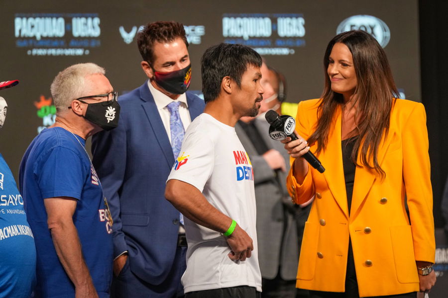 LAS VEGAS, NV – AUGUST 20: Manny Pacquiao speaks with Heidi Androl following the face-off at the official weigh-ins during the official weigh-in for Pacquiao vs. Ugas on August 20, 2021 at MGM Grand Garden Arena in Las Vegas, NV. Photo by Louis Grasse/PxImages/Icon Sportswire BOXING: AUG 21 Pacquiao v Ugas Official Weigh-In Icon2108211012