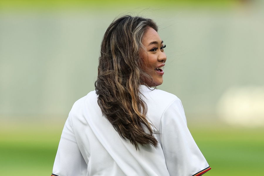 MINNEAPOLIS, MN – AUGUST 05: Olympic gold medal gymnast Sunisa Lee looks on before throwing out the ceremonial first pitch before the start of the game between the Toronto Blue Jays and Minnesota Twins at Target Field on August 5, 2022 in Minneapolis, Minnesota. The Twins defeated the Blue Jays 6-5 in ten innings. (Photo by David Berding/Getty Images)