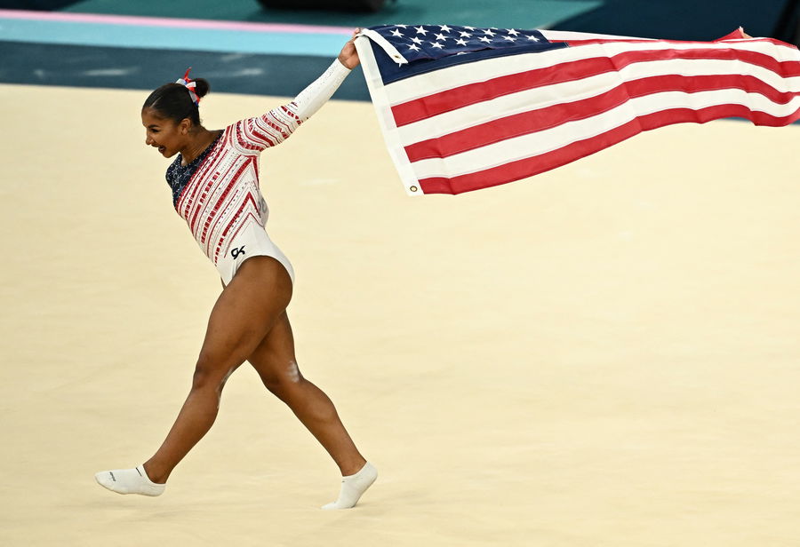 Paris 2024 Olympics – Artistic Gymnastics – Women’s Team Final – Bercy Arena, Paris, France – July 30, 2024. Jordan Chiles of United States celebrates with a United States flag after winning gold REUTERS/Dylan Martinez