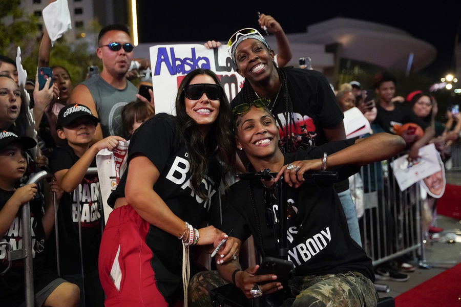 Oct 23, 2023; Las Vegas, NV, USA; Las Vegas guards Kelsey Plum (10), Sydney Colson (51) and Chelsea Gray (12) pose for a photo op during the Las Vegas Aces championship parade at Toshiba Plaza. Mandatory Credit: Lucas Peltier-USA TODAY Sports