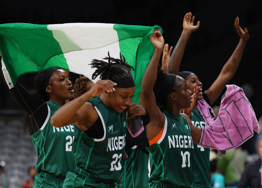 Paris 2024 Olympics – Basketball – Women’s Group Phase – Group B – Canada vs Nigeria – Lille, Pierre Mauroy Stadium, Villeneve-d’Ascq, France – August 04, 2024. Ezinne Kalu of Nigeria celebrates the team’s win with Promise Amukamara of Nigeria REUTERS/Brian Snyder