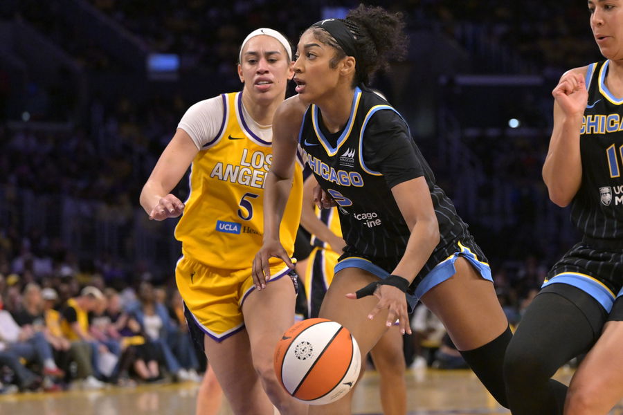 Jun 29, 2025; Los Angeles, California, USA; Chicago Sky forward Angel Reese (5) drives past Los Angeles Sparks forward Dearica Hamby (5) in the second half at Crypto.com Arena. Mandatory Credit: Jayne Kamin-Oncea-Imagn Images