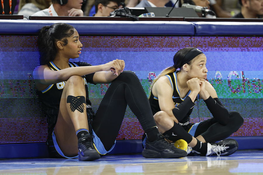 Aug 25, 2024; Chicago, Illinois, USA; Chicago Sky forward Angel Reese (5) and guard Chennedy Carter (7) wait to enter the game against the Las Vegas Aces during the first half at Wintrust Arena. Mandatory Credit: Kamil Krzaczynski-USA TODAY Sports