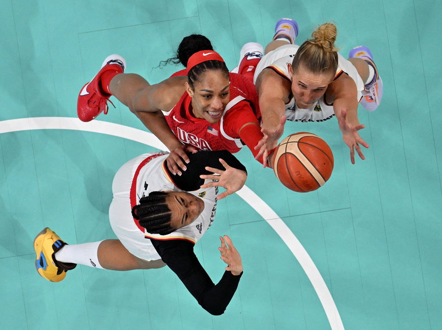 Paris 2024 Olympics – Basketball – Women’s Group Phase – Group C – Germany vs United States – Lille, Pierre Mauroy Stadium, Villeneve-d’Ascq, France – August 04, 2024. A’Ja Wilson of United States in action against Leonie Fiebich of Germany and Satou Sabally of Germany Pool via REUTERS/Antonin Thuillier