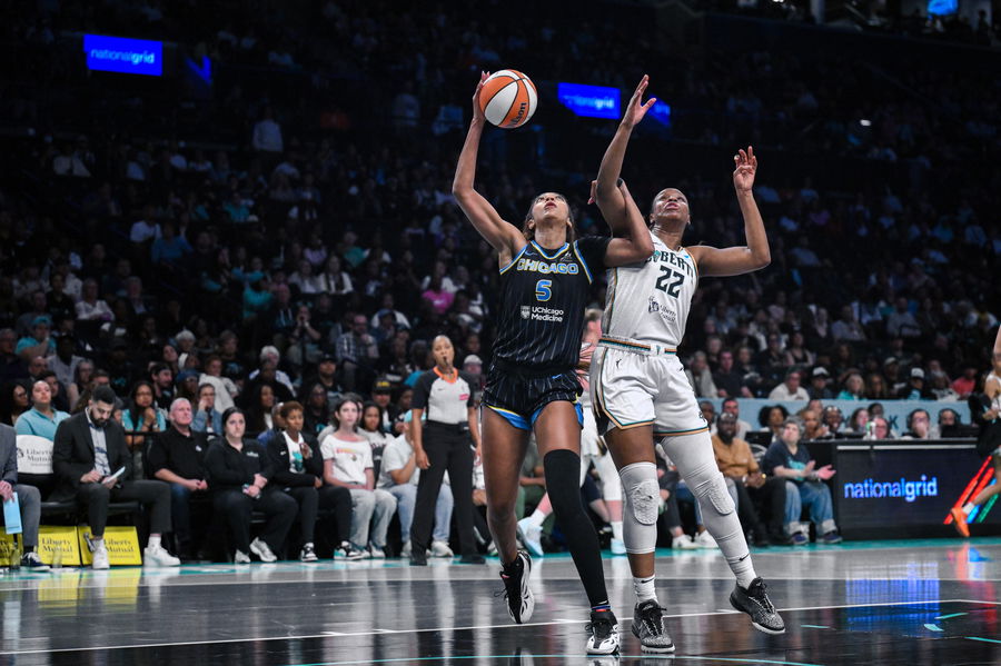 Aug 21, 2025; Brooklyn, New York, USA; Chicago Sky forward Angel Reese (5) shoots the ball while defended by New York Liberty forward Kennedy Burke (22) during the first half at Barclays Center. Mandatory Credit: John Jones-Imagn Images