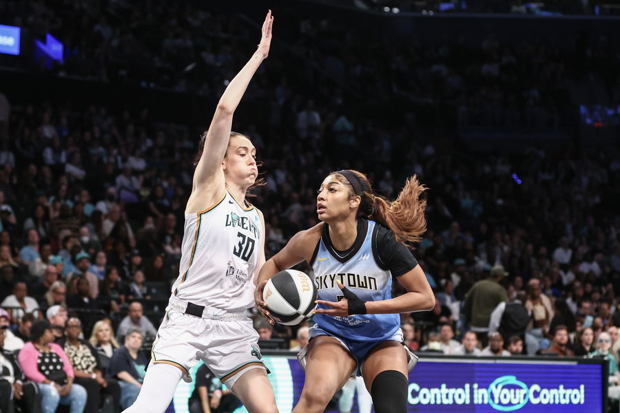 Jun 10, 2025; Brooklyn, New York, USA; Chicago Sky forward Angel Reese (5) looks to post up against New York Liberty forward Breanna Stewart (30) in the first quarter at Barclays Center. Mandatory Credit: Wendell Cruz-Imagn Images