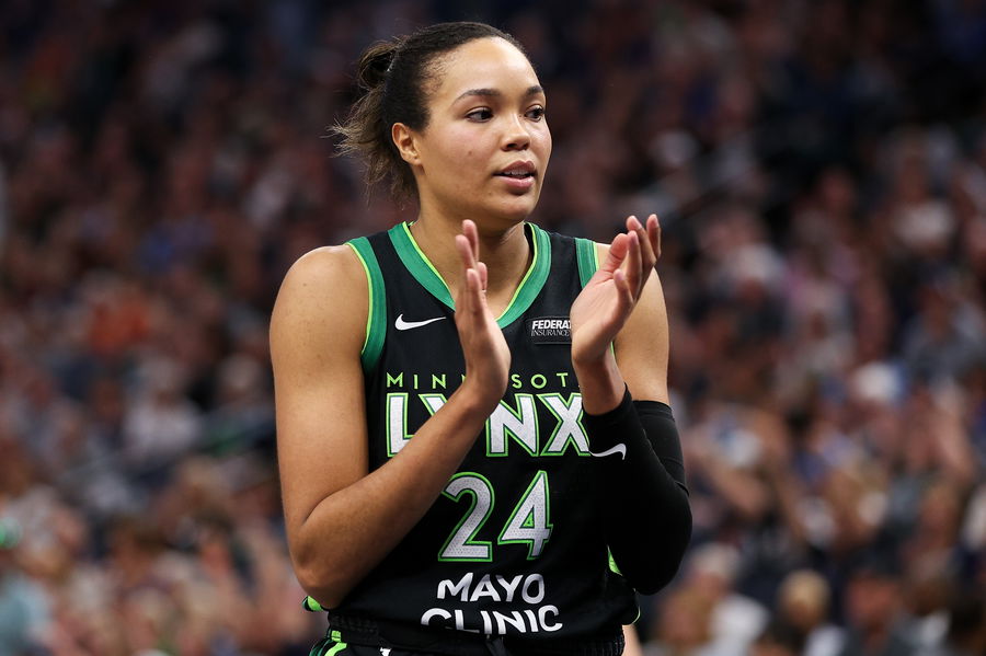Sep 29, 2024; Minneapolis, Minnesota, USA; Minnesota Lynx forward Napheesa Collier (24) reacts during the first half against the Connecticut Sun of game one of the 2024 WNBA Semi-finals at Target Center. Mandatory Credit: Matt Krohn-Imagn Images