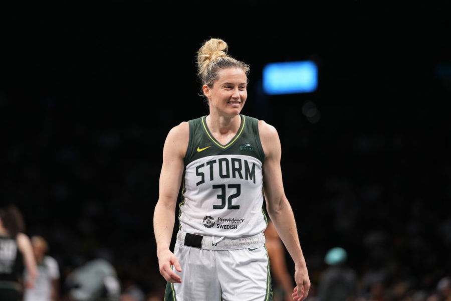 BROOKLYN, NY – JULY 8: Sami Whitcomb #32 of the Seattle Storm smiles during the game against the New York Liberty on July 8, 2023 in Brooklyn, New York. NOTE TO USER: User expressly acknowledges and agrees that, by downloading and or using this photograph, user is consenting to the terms and conditions of the Getty Images License Agreement. Mandatory Copyright Notice: Copyright 2023 NBAE (Photo by Evan Yu/NBAE via Getty Images)