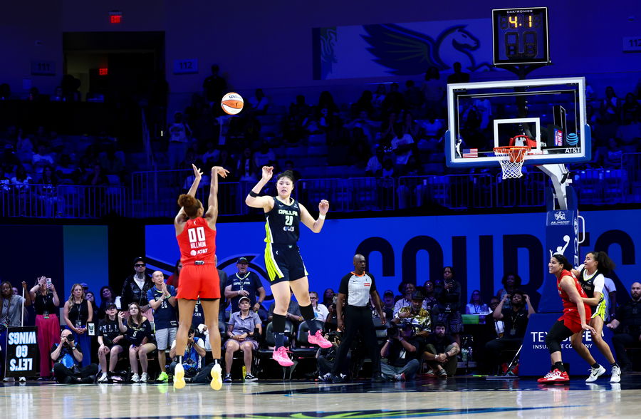 Jul 30, 2025; Arlington, Texas, USA; Atlanta Dream forward Naz Hillmon (00) hits the game-winning shot over Dallas Wings center Li Yueru (28) during the second half at College Park Center. Mandatory Credit: Kevin Jairaj-Imagn Images