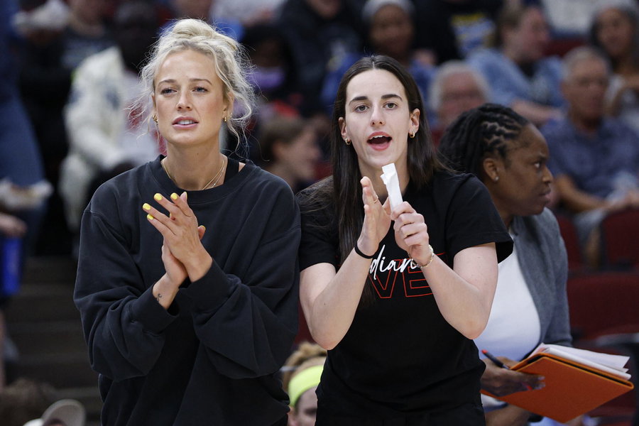 Jun 7, 2025; Chicago, Illinois, USA; Injured Indiana Fever guard Sophie Cunningham (8) and guard Caitlin Clark (22) react from the bench during the first half of a WNBA game against the Chicago Sky at United Center. Mandatory Credit: Kamil Krzaczynski-Imagn Images
