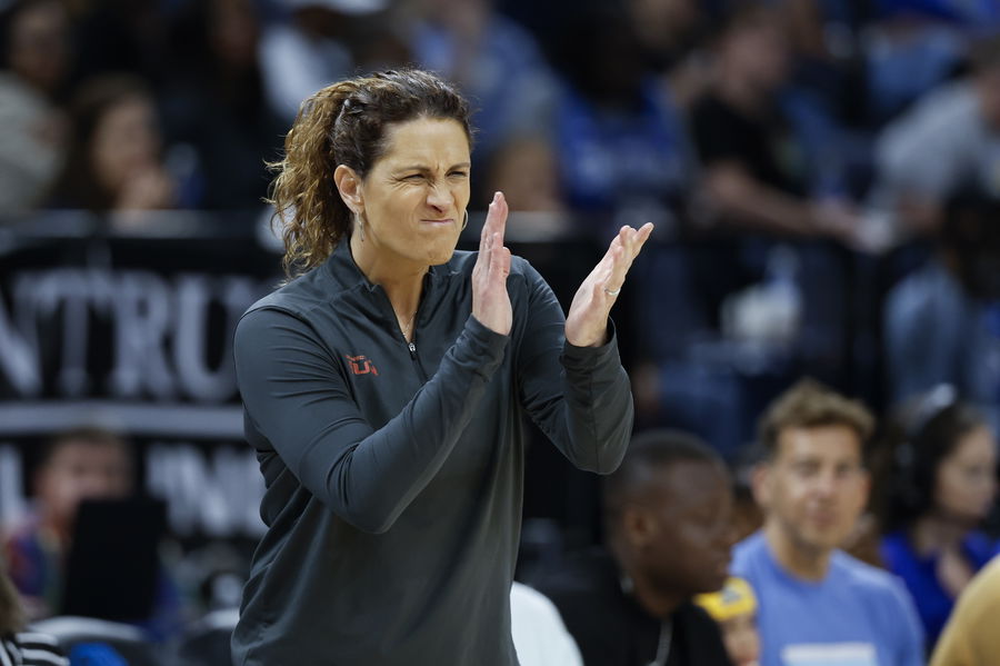 Jun 12, 2024; Chicago, Illinois, USA; Connecticut Sun head coach Stephanie White applauds her team during the first half of a basketball game against the Chicago Sky at Wintrust Arena. Mandatory Credit: Kamil Krzaczynski-USA TODAY Sports
