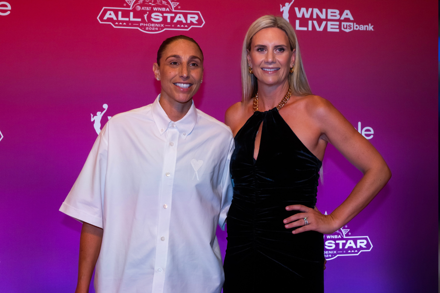 Jul 18, 2024; Phoenix, AZ, USA; Phoenix Mercury player Diana Taurasi (left) and wife Penny Taylor walk the red carpet during the WNBA All Star weekend at the Phoenix Convention Center. Mandatory Credit: Mark J. Rebilas-Imagn Images