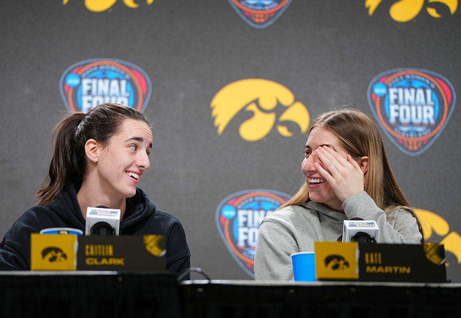 Iowa Hawkeyes guard Caitlin Clark (22) and Iowa Hawkeyes guard Kate Martin (20) take questions at Rocket Mortgage Arena, Thursday, April 4, 2024 in Cleveland.