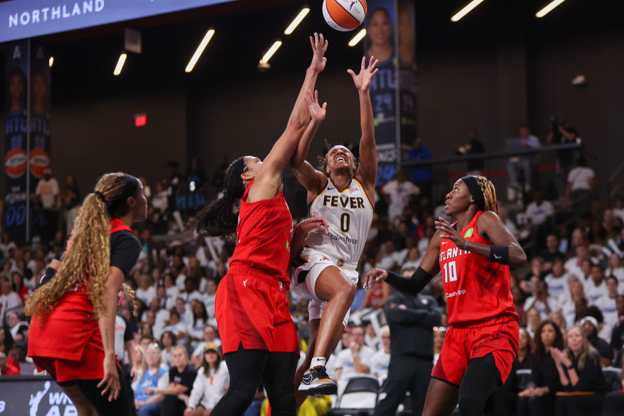 Sep 14, 2025; College Park, Georgia, USA; Indiana Fever guard Kelsey Mitchell (0) shoots past Atlanta Dream forward Brionna Jones (24) and guard Rhyne Howard (10) in the fourth quarter during game one of round one for the 2025 WNBA Playoffs at Gateway Center Arena at College Park. Mandatory Credit: Brett Davis-Imagn Images