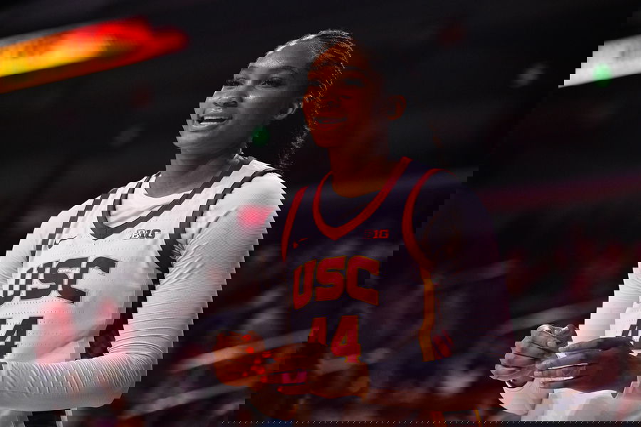 LOS ANGELES, CA – NOVEMBER 09: USC Trojans forward Kiki Iriafen 44 warms up before the womenÕs college basketball game between the Cal Poly Mustangs and the USC Trojans on November 9, 2024 at Galen Center in Los Angeles, CA. Photo by Brian Rothmuller/Icon Sportswire COLLEGE BASKETBALL: NOV 09 Women s – Cal Poly at USC EDITORIAL USE ONLY Icon241109068