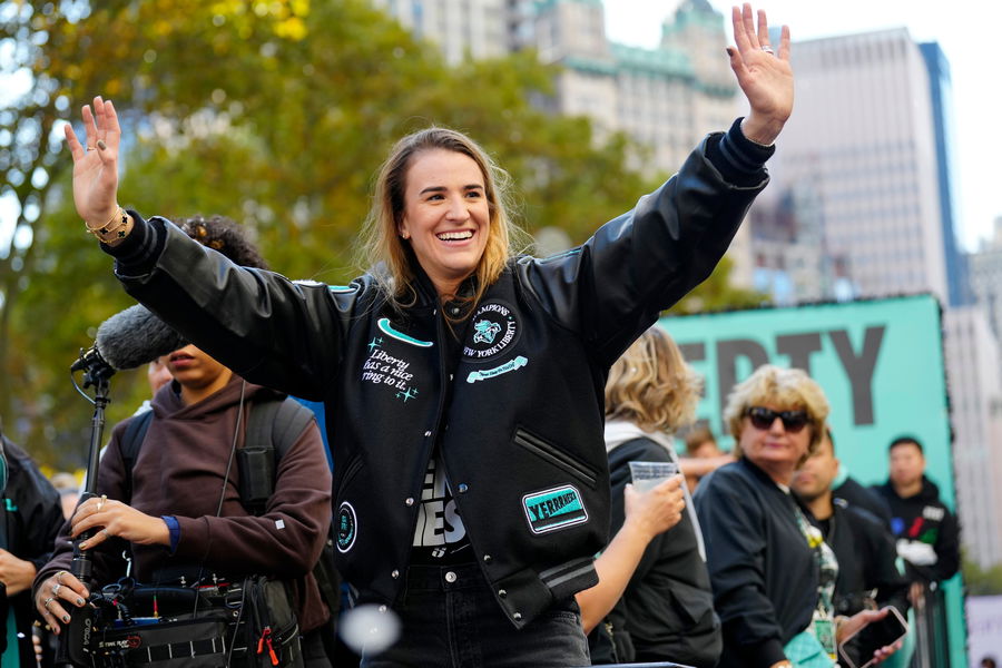 Sabrina Ionescu, of the New York Liberty acknowledges the fans, Thursday, October 24, 2024, in Manhattan.