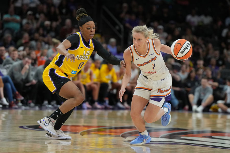 May 21, 2025; Phoenix, Arizona, USA; Phoenix Mercury guard Alexa Held (1) drives past Los Angeles Sparks guard Odyssey Sims (0) in the second half at Footprint Center. Mandatory Credit: Rick Scuteri-Imagn Images