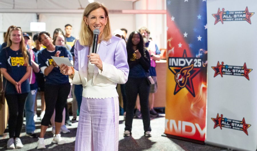 WNBA Commissioner Cathy Engelbert speaks to volunteers gathered Thursday, July 17, 2025, as part of the WNBA’s Changemaker Day held at Indianapolis Motor Speedway. The community service initiative is hosted by the WNBA All-Star 2025 Host Committee, Project Period Indy, and Indy Hygiene Hub.