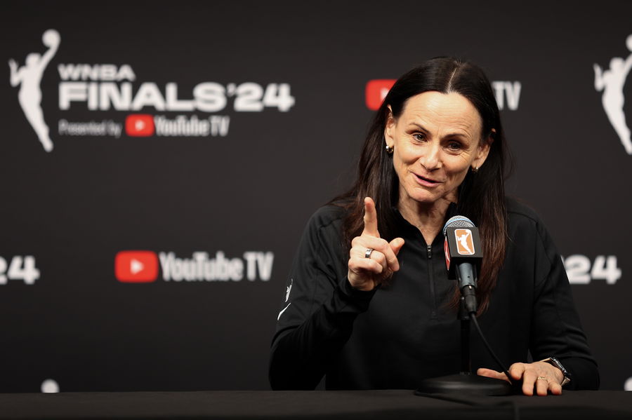 Oct 18, 2024; Minneapolis, Minnesota, USA; New York Liberty head coach Sandy Brondello talks to the media before game four of the 2024 WNBA Finals against the Minnesota Lynx at Target Center. Mandatory Credit: Matt Krohn-Imagn Images