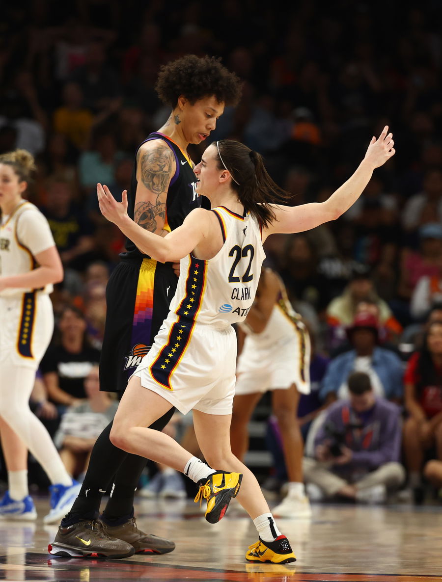 Jun 30, 2024; Phoenix, Arizona, USA; Indiana Fever guard Caitlin Clark (22) against Phoenix Mercury center Brittney Griner (42) during a WNBA game at Footprint Center. Mandatory Credit: Mark J. Rebilas-USA TODAY Sports