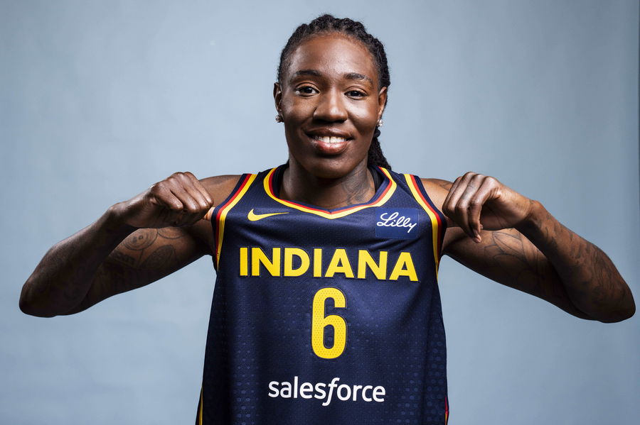 Apr 30, 2025; Indianapolis, IN, USA; Indiana Fever forward Natasha Howard poses for a photo Wednesday, April 30, 2025, during the Indiana Fever media day at Gainbridge Fieldhouse in Indianapolis. Mandatory Credit: Grace Smith-USA TODAY Network via Imagn Images
