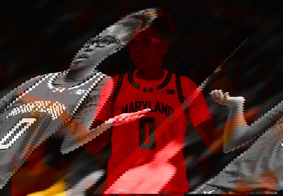 IOWA CITY, IA – JANUARY 05: Maryland guard Shyanne Sellers 0 reacts after getting called for a foul during a women s basketball game between the Maryland Terrapins and the Iowa Hawkeyes, on January 05, 2025, at Carver-Hawkeye Arena, Iowa City, IA. Photo by Keith Gillett/IconSportswire COLLEGE BASKETBALL: JAN 05 Women s – Maryland at Iowa EDITORIAL USE ONLY Icon250105108