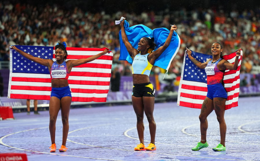 Paris 2024 Olympics – Athletics – Women’s 100m Final – Stade de France, Saint-Denis, France – August 03, 2024. Gold medallist Julien Alfred of Saint Lucia celebrates after winning the final alongside silver medallist Sha’carri Richardson of United States and bronze medallist Melissa Jefferson of United States. REUTERS/Aleksandra Szmigiel