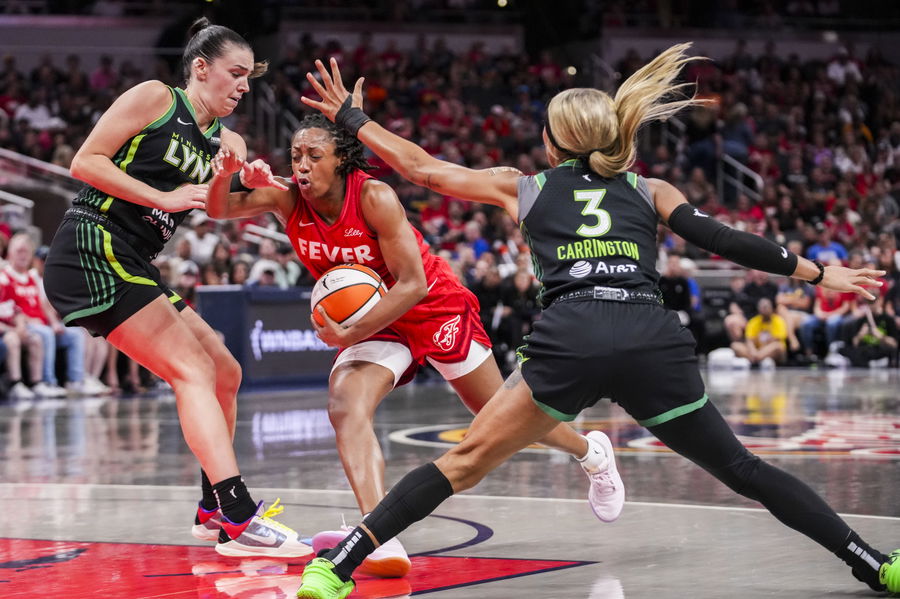 Aug 22, 2025; Indianapolis, IN, USA; Indiana Fever guard Kelsey Mitchell (0) moves past Minnesota Lynx forward Bridget Carleton (6) and guard DiJonai Carrington (3) at Gainbridge Fieldhouse. Mandatory Credit: Grace Smith/USA Today Network via Imagn Images