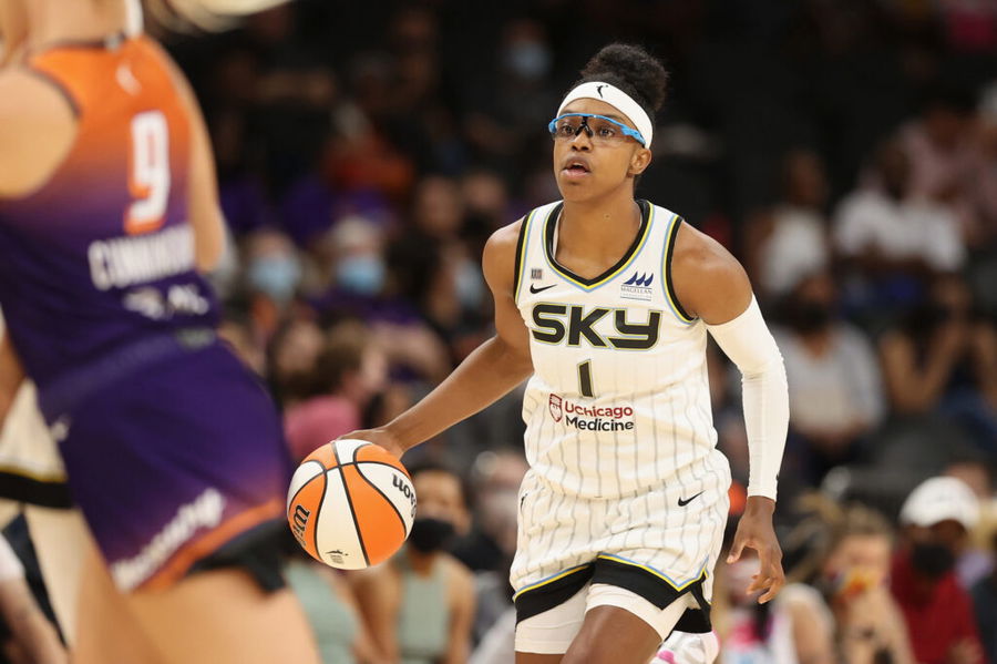 PHOENIX, ARIZONA – AUGUST 31: Diamond DeShields #1 of the Chicago Sky handles the ball against the Phoenix Mercury during the first half of the WNBA game at the Footprint Center on August 31, 2021 in Phoenix, Arizona. (Photo by Christian Petersen/Getty Images)