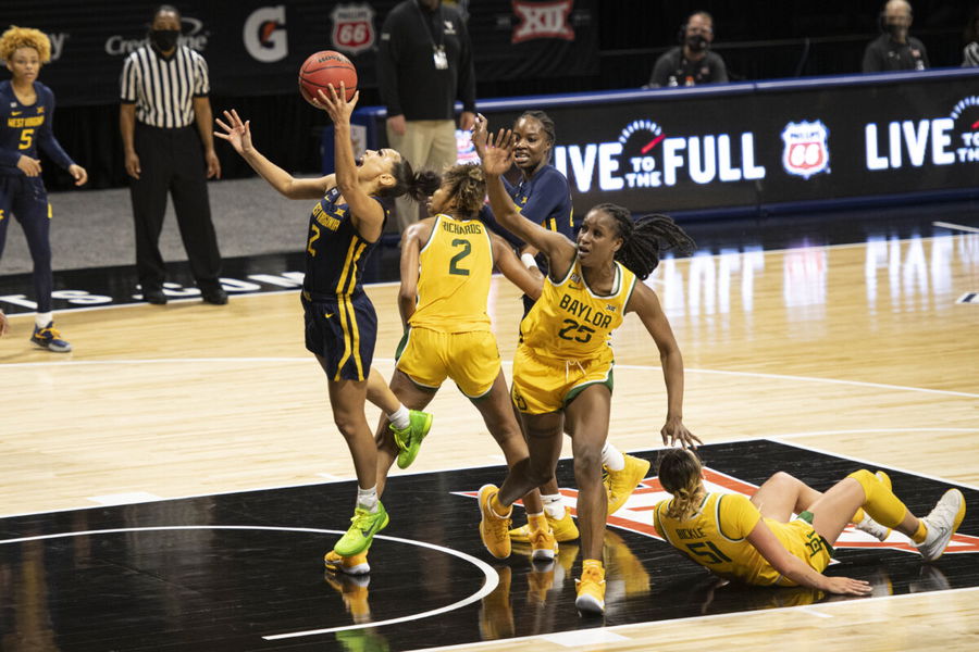 Mar 14, 2021; Kansas City, Missouri, USA; West Virginia Mountaineers guard Kysre Gondrezick (2) shoots the ball after driving past Baylor Lady Bears center Queen Egbo (25) in the second half at Municipal Auditorium. Mandatory Credit: Amy Kontras-USA TODAY Sports
