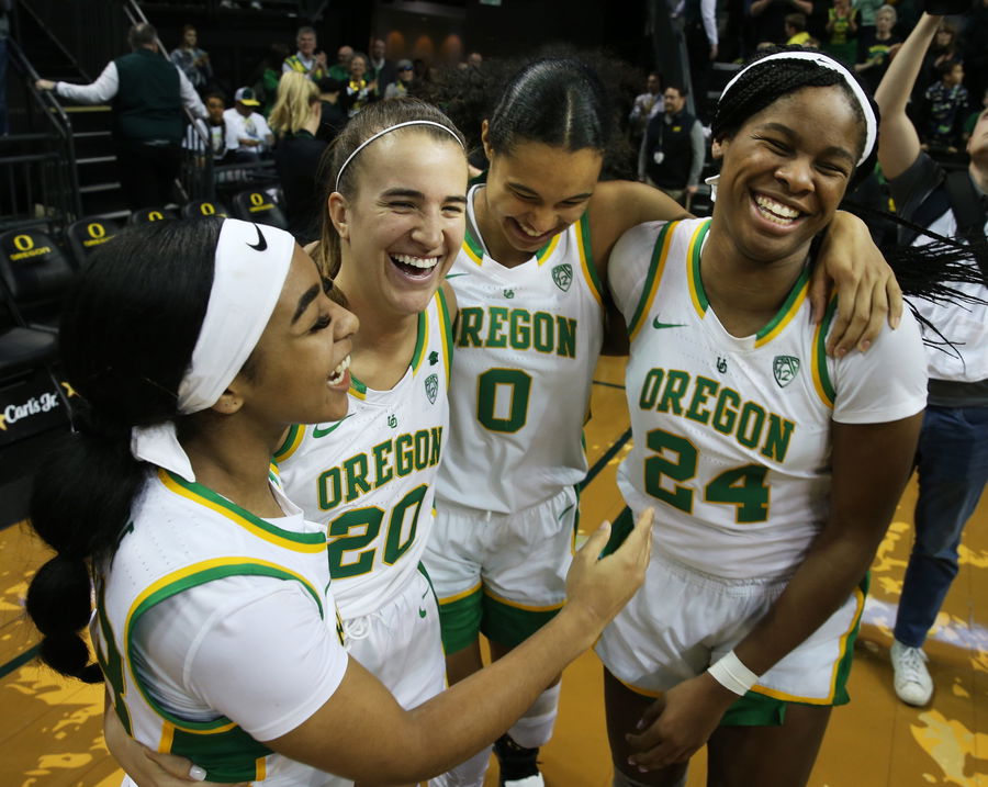 Oregon’s Minyon Moore, left, Sabrina Ionescu, Satou Sabally and Ruthy Hebard celebrate together after defeating Washington in the last regular season home game.